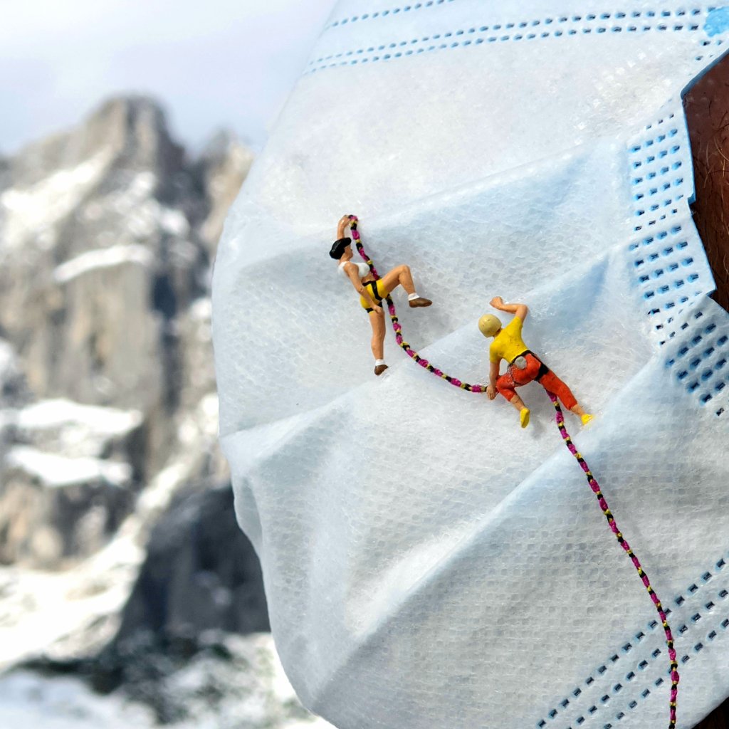 #velsimo #streetartbyvelsimo #miniature #tiny #art #miniatureart #tinyart #littleguys #macro #miniatures #artist #photographer #mask #mountain #climbers #rope #alps #covid19 #upsidedown